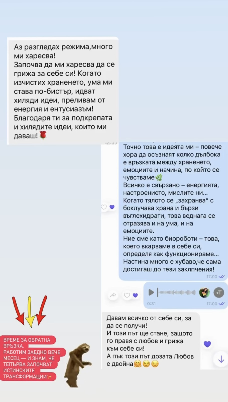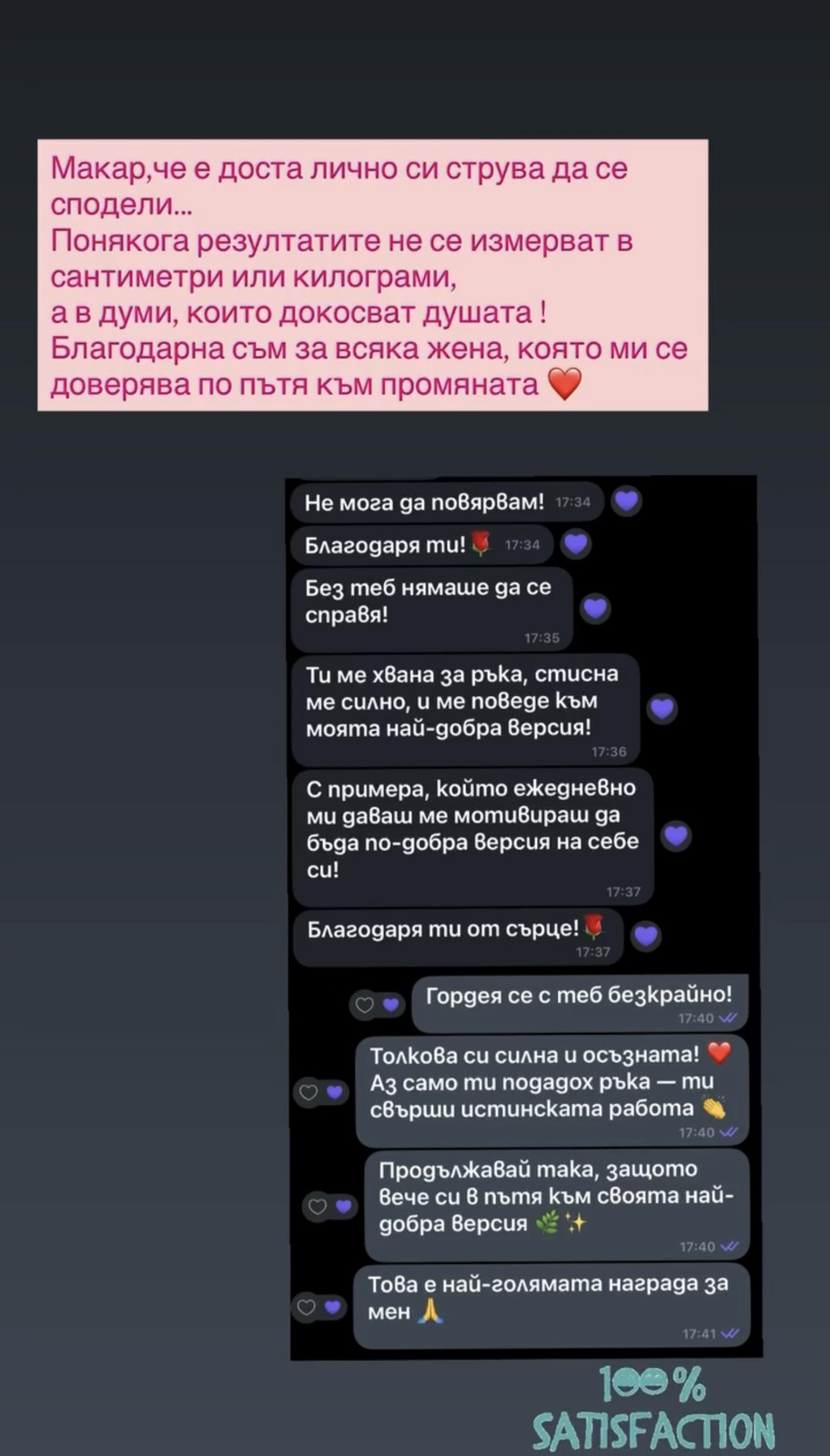 Затова моят подход е различен, без крайности, без лишения и без сляпо следване на режими. Уча жените как да изградят устойчив начин на живот, в който храненето и тренировките са част от ежедневието, а не временна мярка. Не работим със забрани и калории, а с разбиране, навици и баланс.