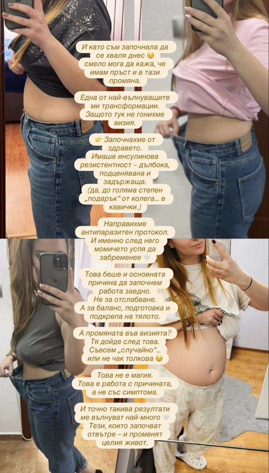 Като жена съм минала и през много трансформации - две бременности, възстановяване след тях и периоди на хормонален дисбаланс, в които не съм се чувствала добре без ясна причина. В много случаи сама, стъпка по стъпка, чрез изследвания и наблюдение, съм откривала корена на проблема и съм се възстановявала. Именно това ме научи да търся причината, а не просто да прикривам симптомите.