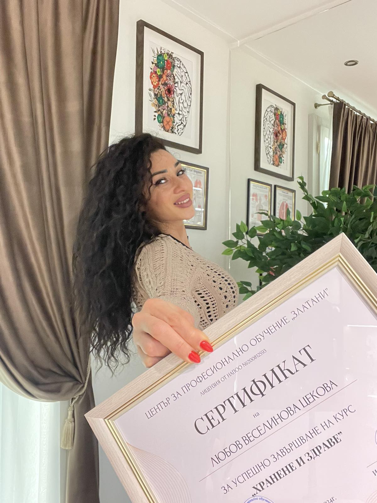 Завършила съм обучения по групови тренировки и фитнес инструктор, клинична нутрициология към Лондонски колеж, както и хранене и здраве. Но образованието не спира дотук - постоянно се развивам, следя новото в науката за хормоните, метаболизма и женското здраве, защото вярвам, че само така мога да давам на клиентките си най-актуалното и работещо за тяхната конкретна ситуация.